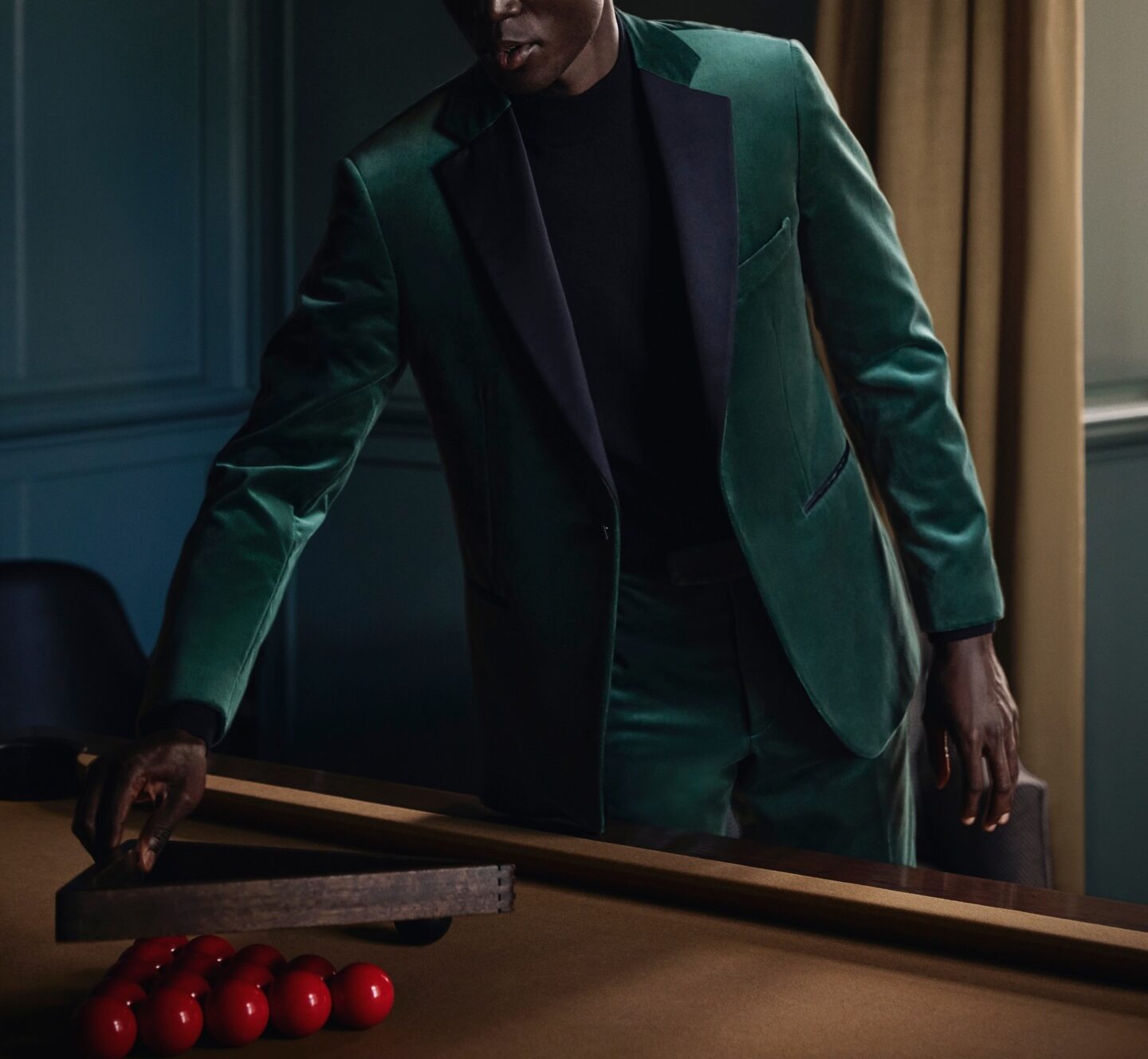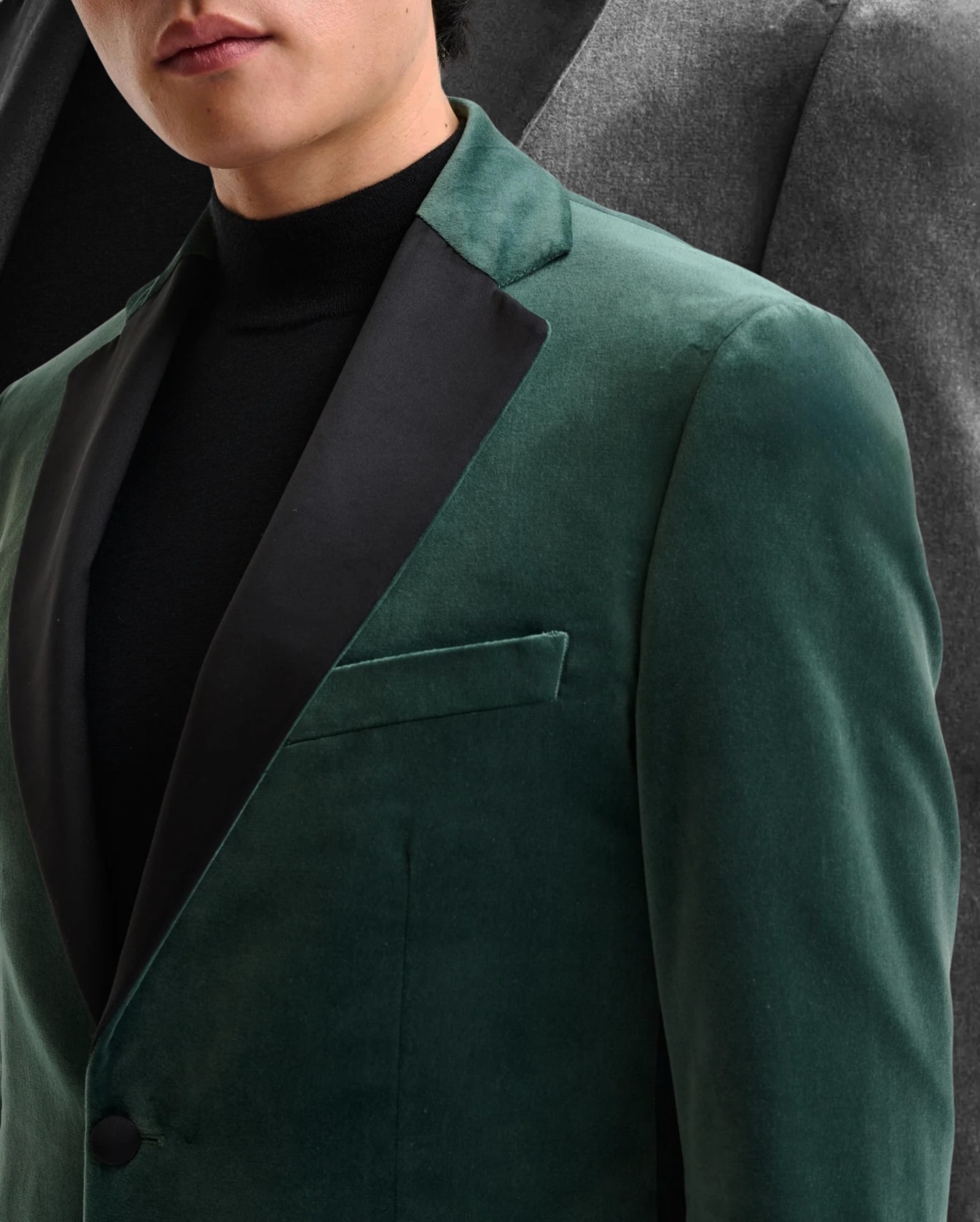 アリストンの格上ベルベットで仕立てるタキシードスーツ。鮮やかなグリーンベースに、襟とクルミボタンをブラックにしてフォーマル感プラス。このくらいのテイストなら、気楽にまねできそう!2026年のフォーマルシーンに向かってチャレンジ~!/生地&PHOTO :Scabal