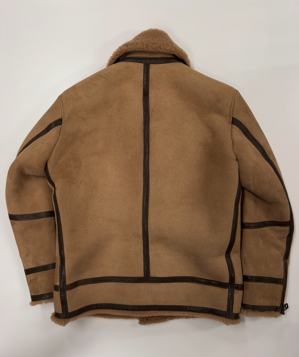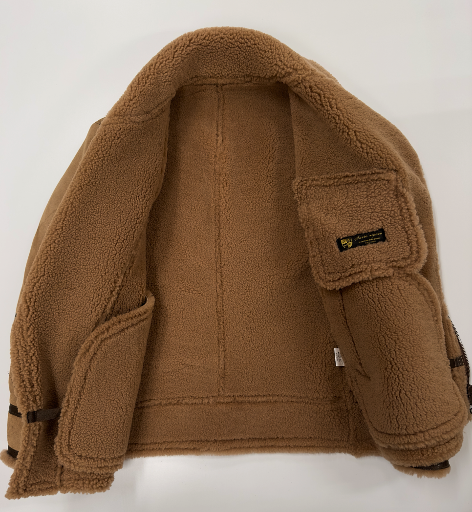キャメルのムートンにブラウンレザーのパイピングを入れた、サルトリパーロデザインのムートンジャケット。