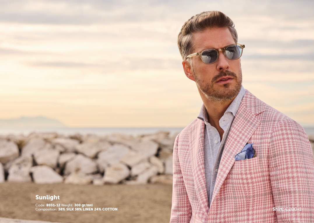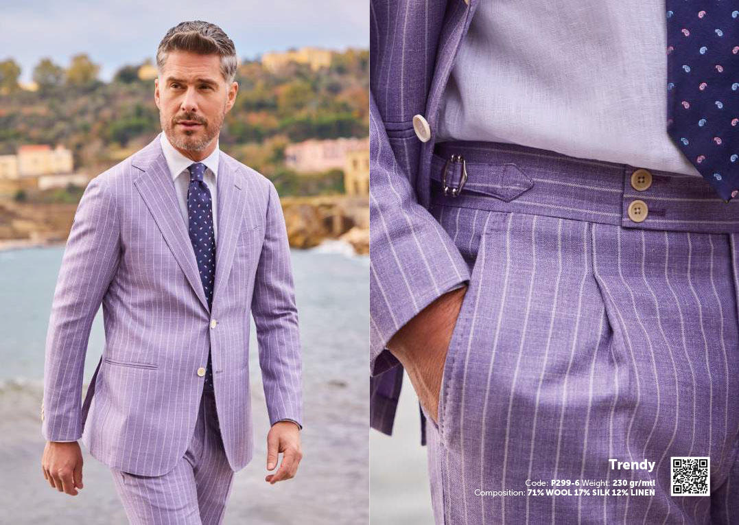ソフトカラーのピンクとライトパープル。今シーズンのイタリー生地ブランド、アリストンもゼニアも推奨している女性受けの良いあまーいテイスト。インナーにラベンダーやシルバーのシャツやカットソーを合わせて、心穏やかな春を迎えましょう~!/生地&Photo:Ariston