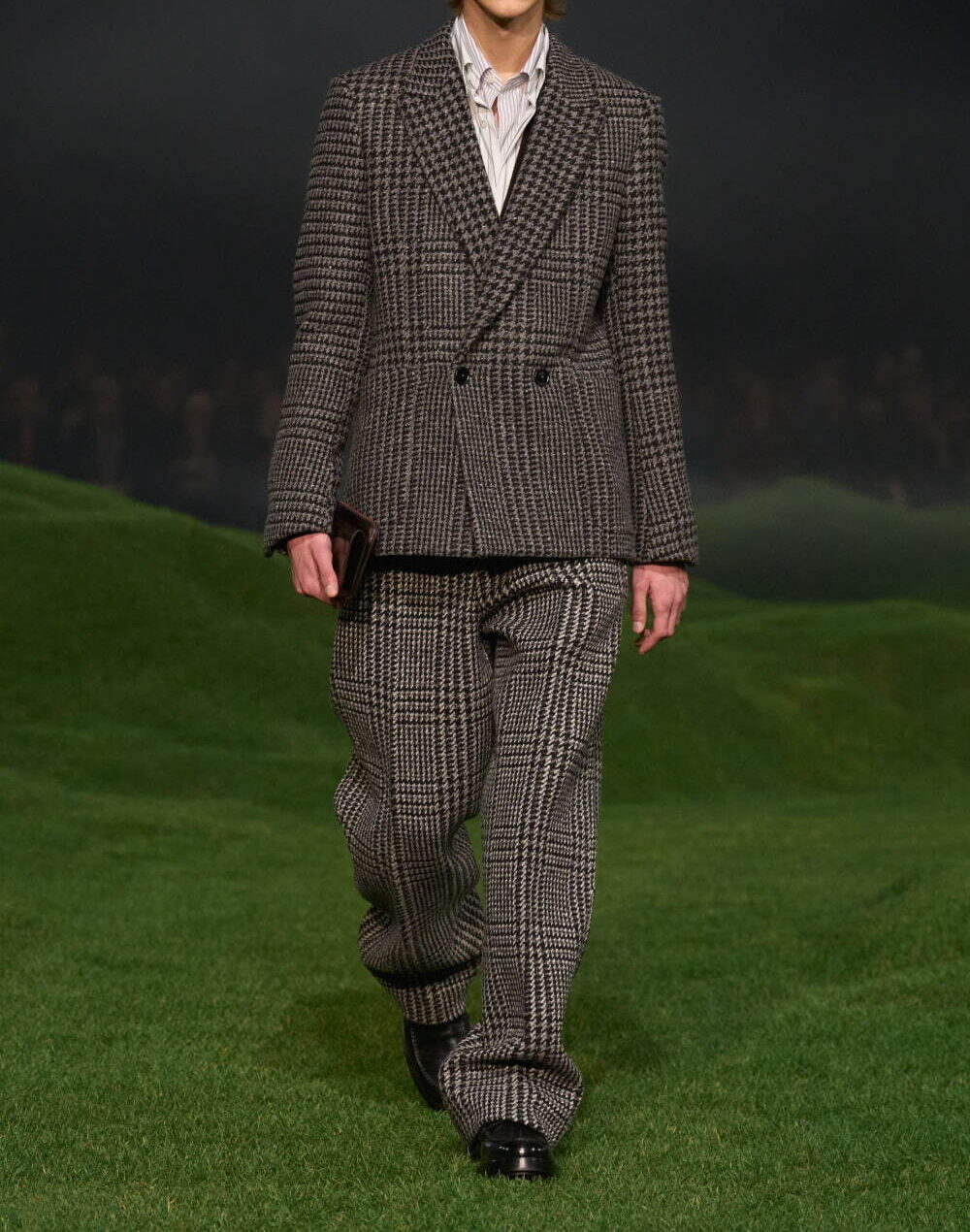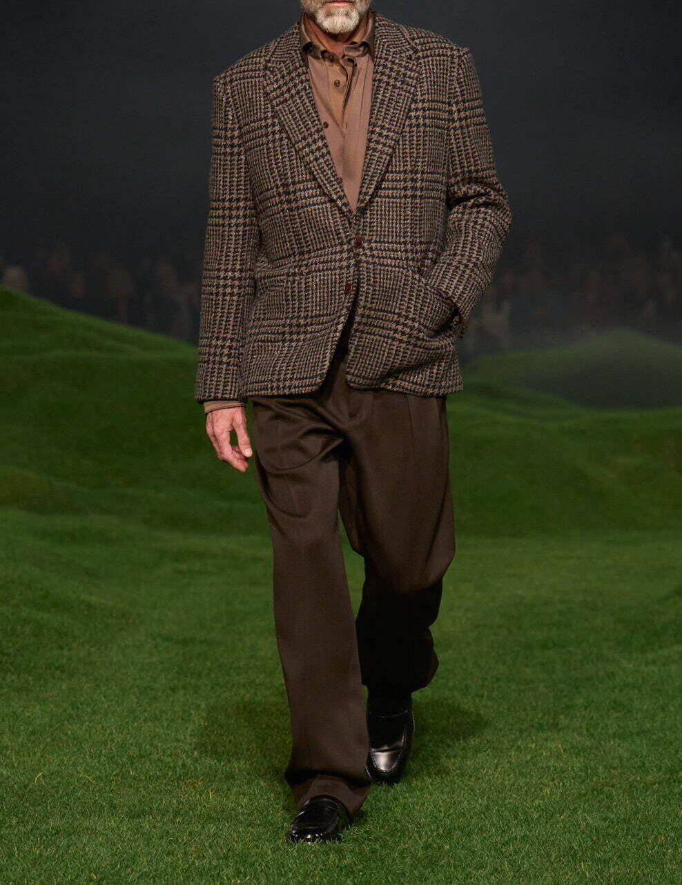 トラディショナルな格子柄をメインにした生地で、ややゆったり目のシルエットが特徴。