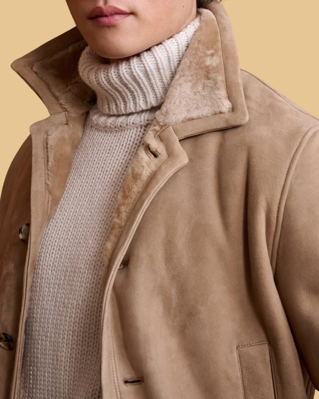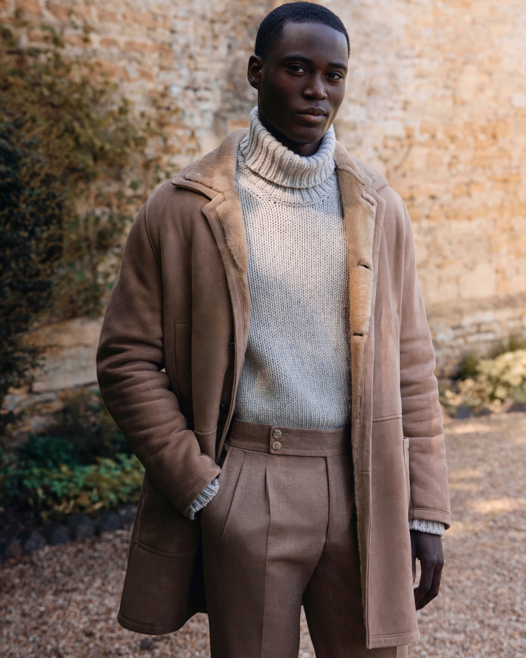 年末年始のお出かけファッションのポイントはに、きちんとみえて、大人の余裕を感じさせるリラックスコーデ。ハイネックのニットにさらりとムートンのコートを合わせて、ボトムはハイクラスウールのパンツベルトレスでキメル!ポイントは、シャキーンと入ったセンタープレス。今年のトレンドのライトベージュがいいんです!/生地&Photo:Scabal